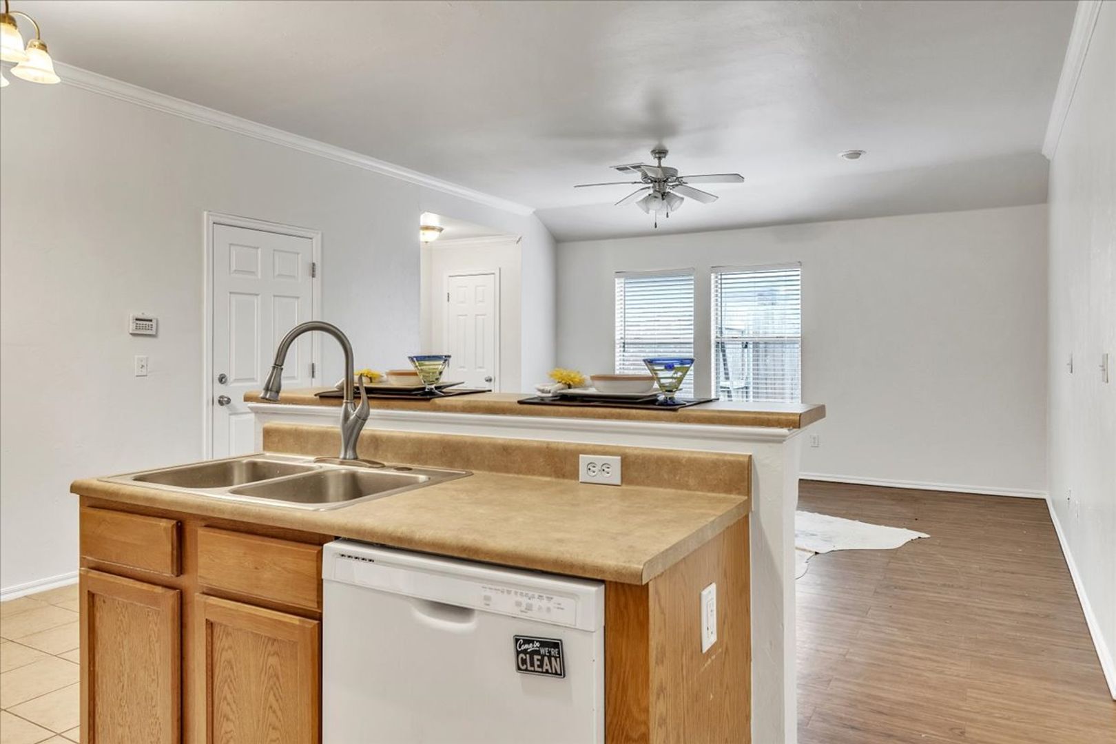 You will love this one! Newer paint and carpet only in the guest bedrooms. All living, kitchen, eating area, hallway and primary bedrooms are vinyl plank. Gated entrance and a 2 car garage. Very open with and Inside utility area and 2" blinds. Primary bedroom with full bathroom, ceiling fan and walk-in closet. Why rent an apartment when you can have a backyard area and a 2 car garage? Not available until after May 1.
